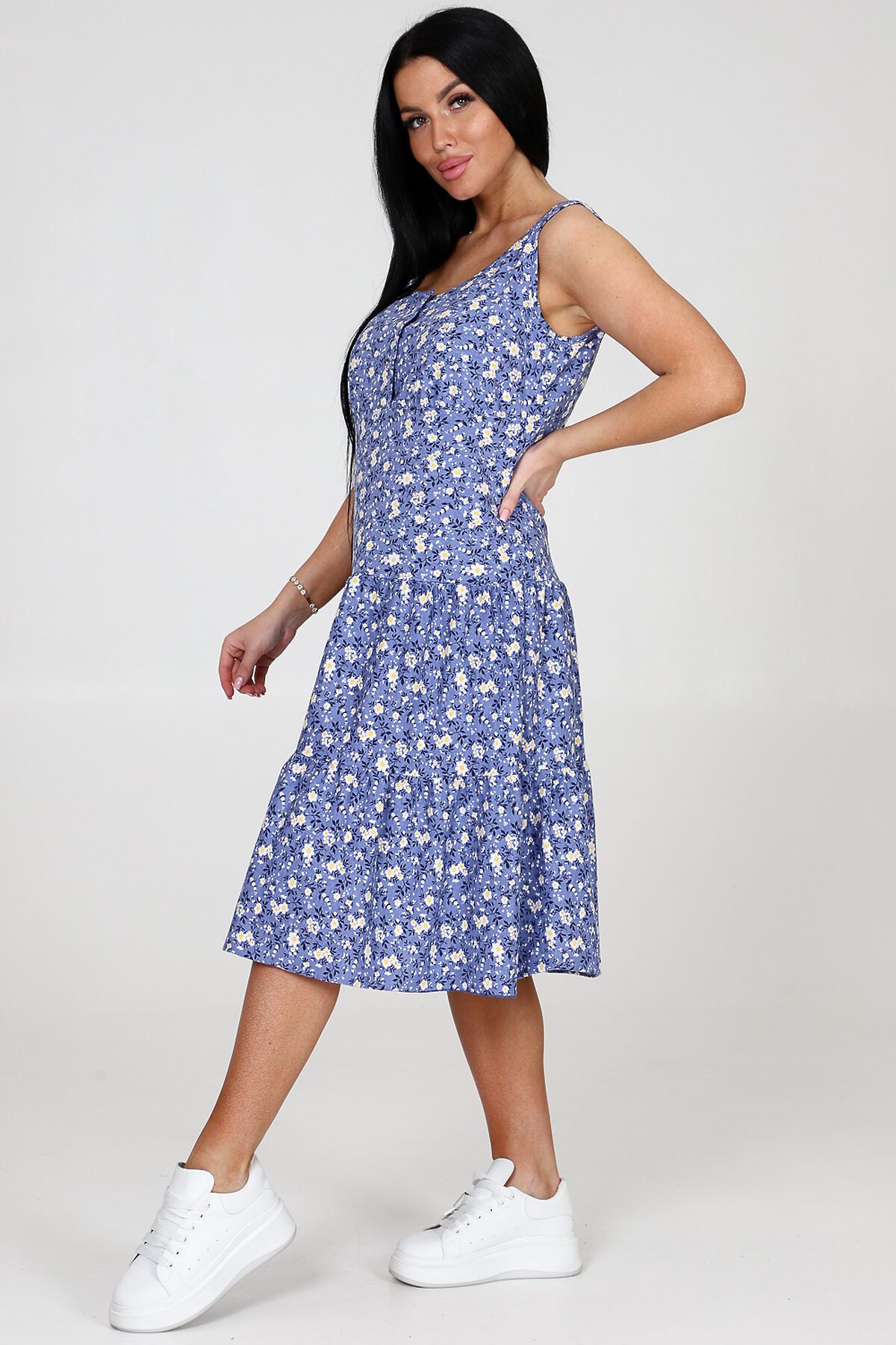 Сарафан женский из кулирки. Сарафан состоит из кокетки, которая застегивается на планку. Юбка изделия состоит из двух ярусов. Горловина и пройма изделия окантована.